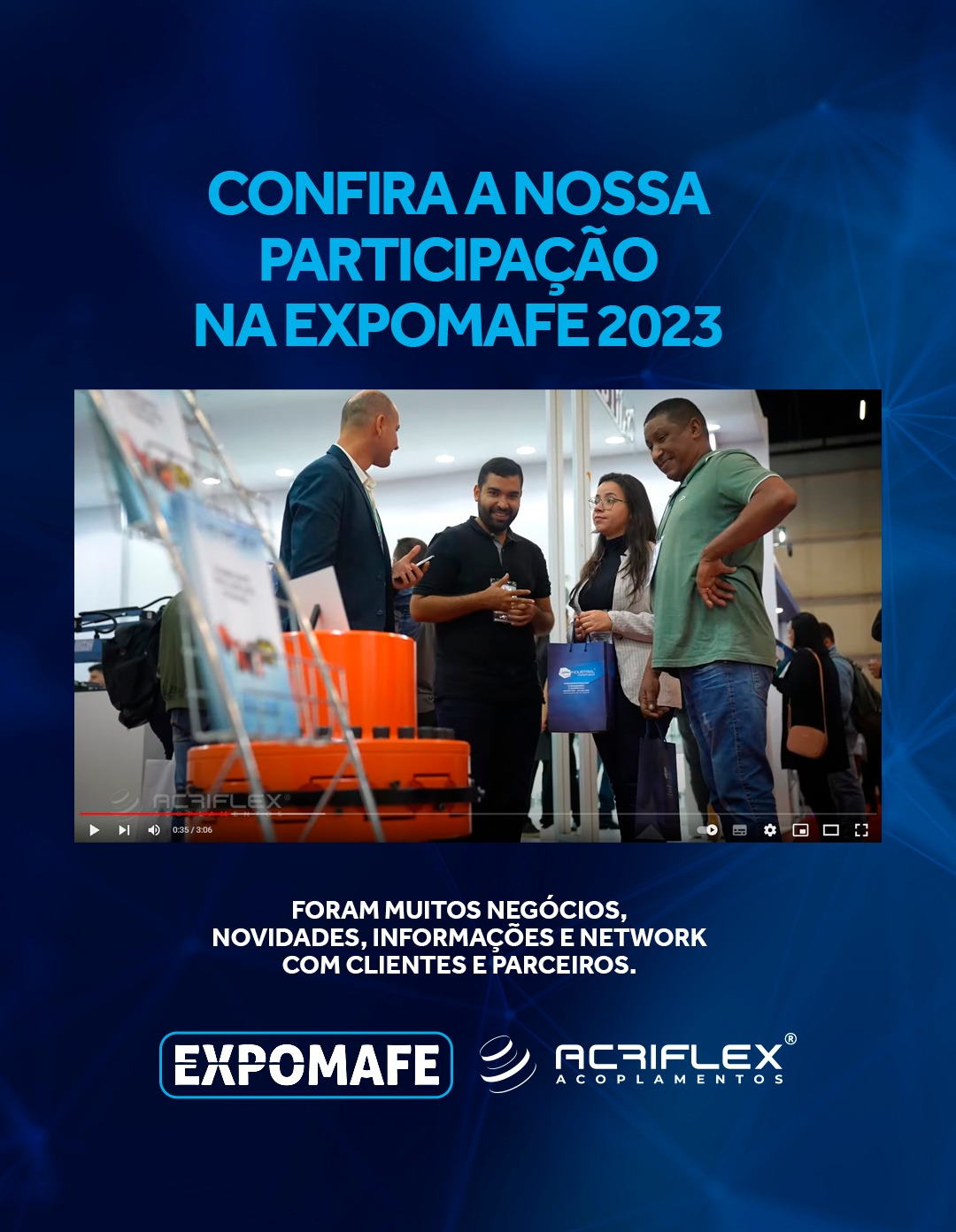 FEIRA EXPOMAFE 2023! De 09 a 13 de Maio a Acriflex esteve presente na Expomafe 2023 - Feira Internacional de Máquinas-Ferramenta e Automação Industrial. Durante os 5 dias de evento, a Acriflex apresentou suas soluções inovadoras e tecnologicamente avançadas, demonstrando o compromisso contínuo com a excelência e a qualidade. Nossa equipe especializada esteve à disposição para fornecer informações detalhadas, orientações técnicas e mostrar como nossos acoplamentos podem impulsionar a produtividade e eficiência nas indústrias. Agradecemos a todos por fazerem parte dessa jornada extraordinária! Até o próximo evento! ?
